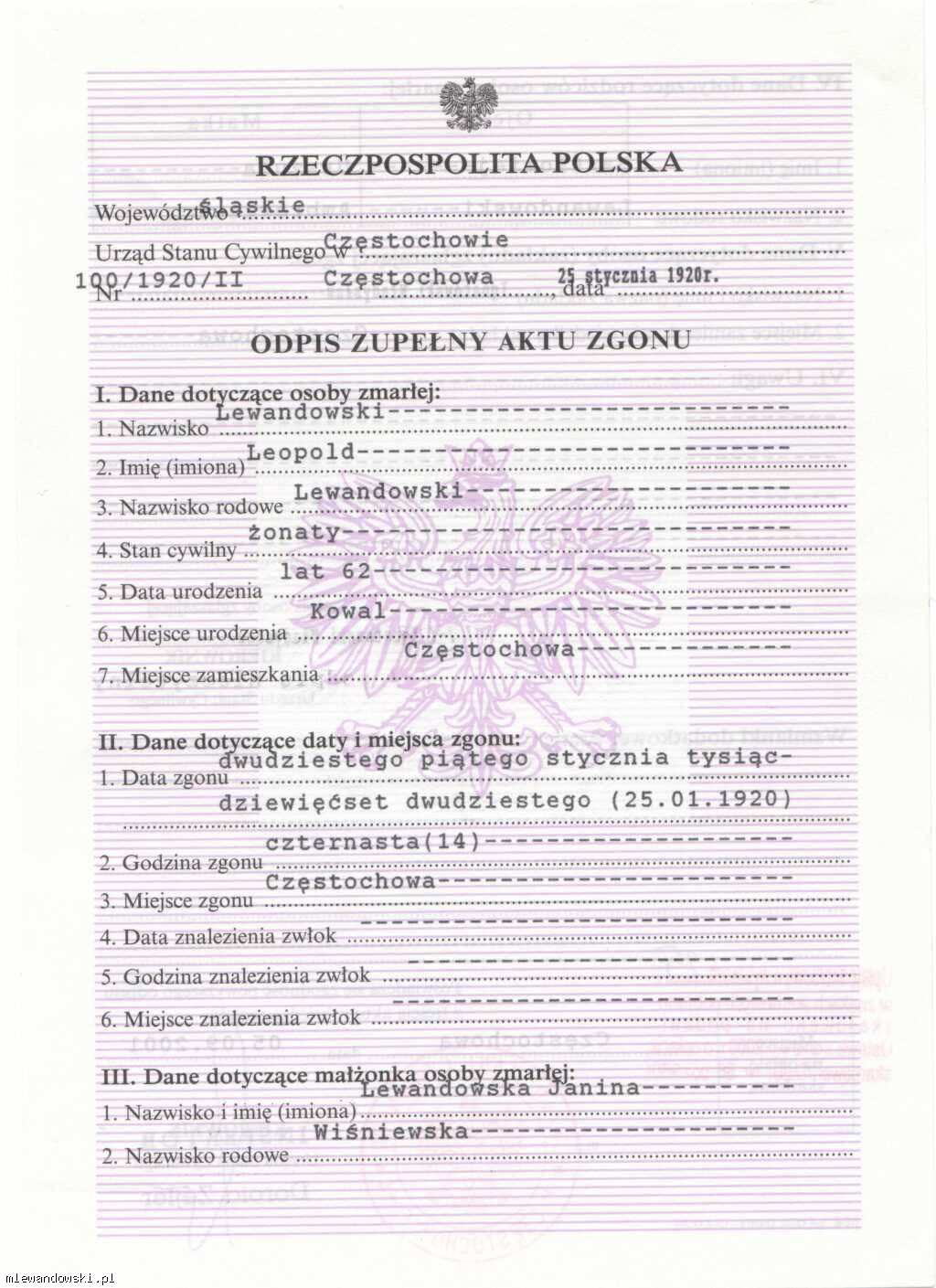 Odpis zupełny aktu zgonu Leopold Lewandowski.